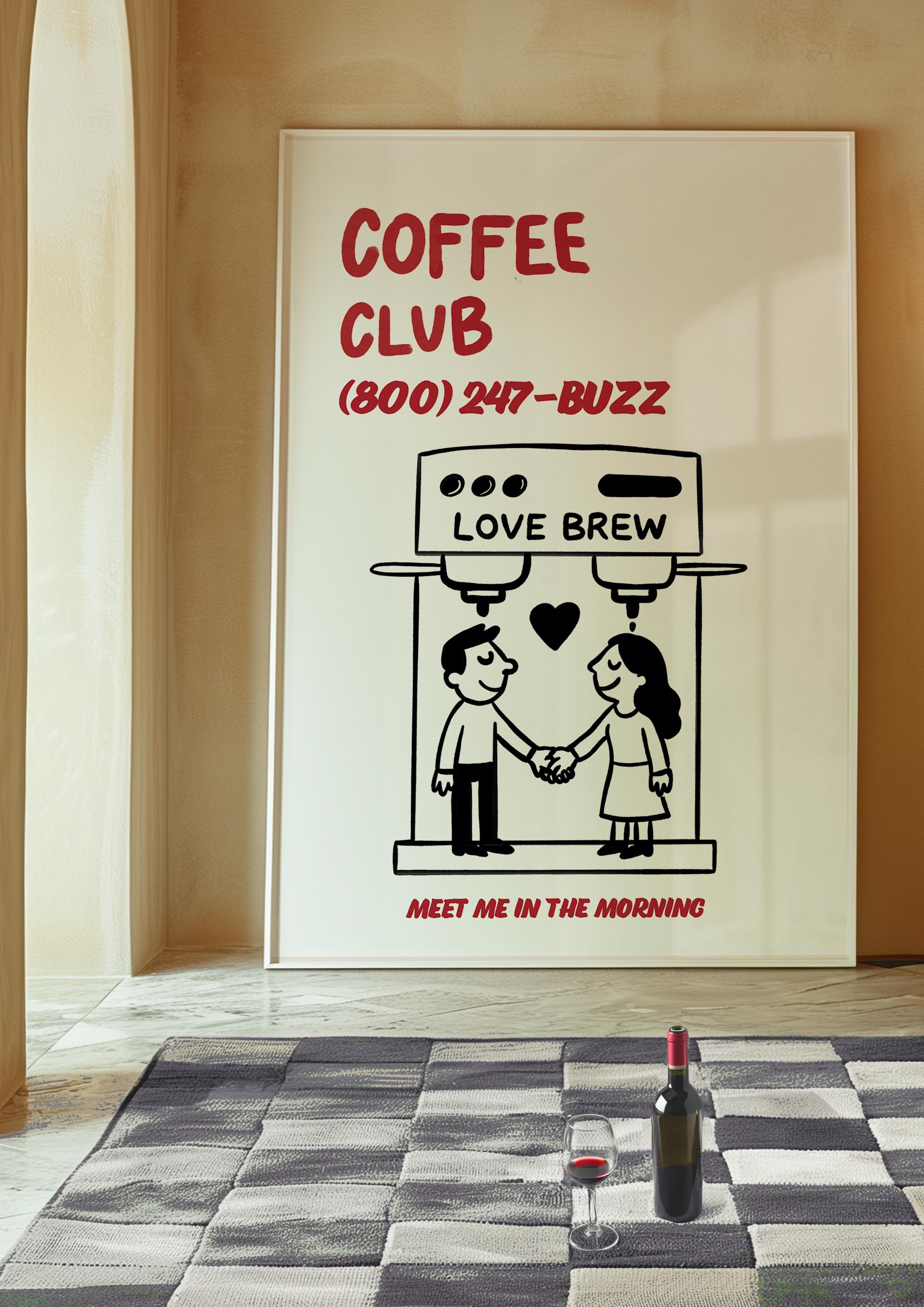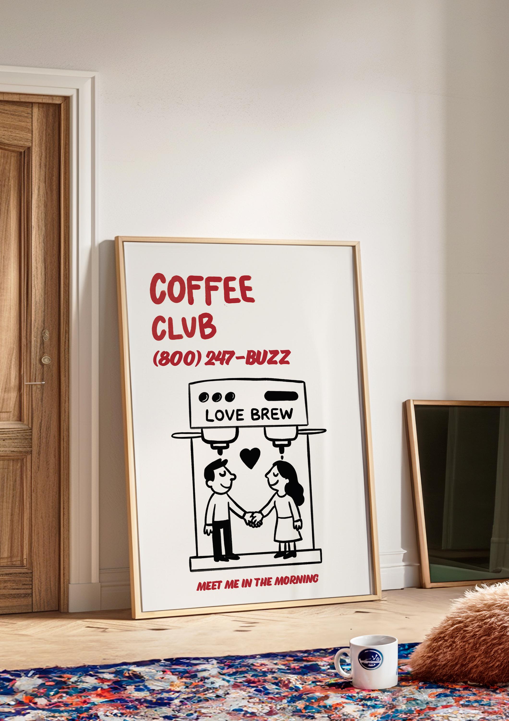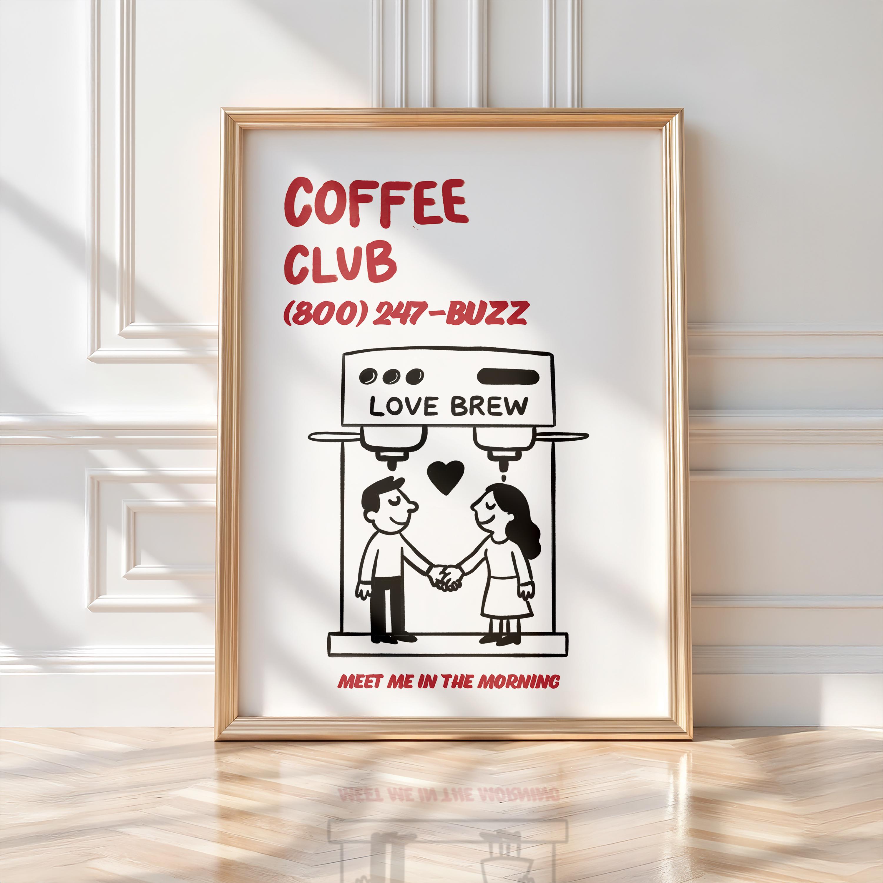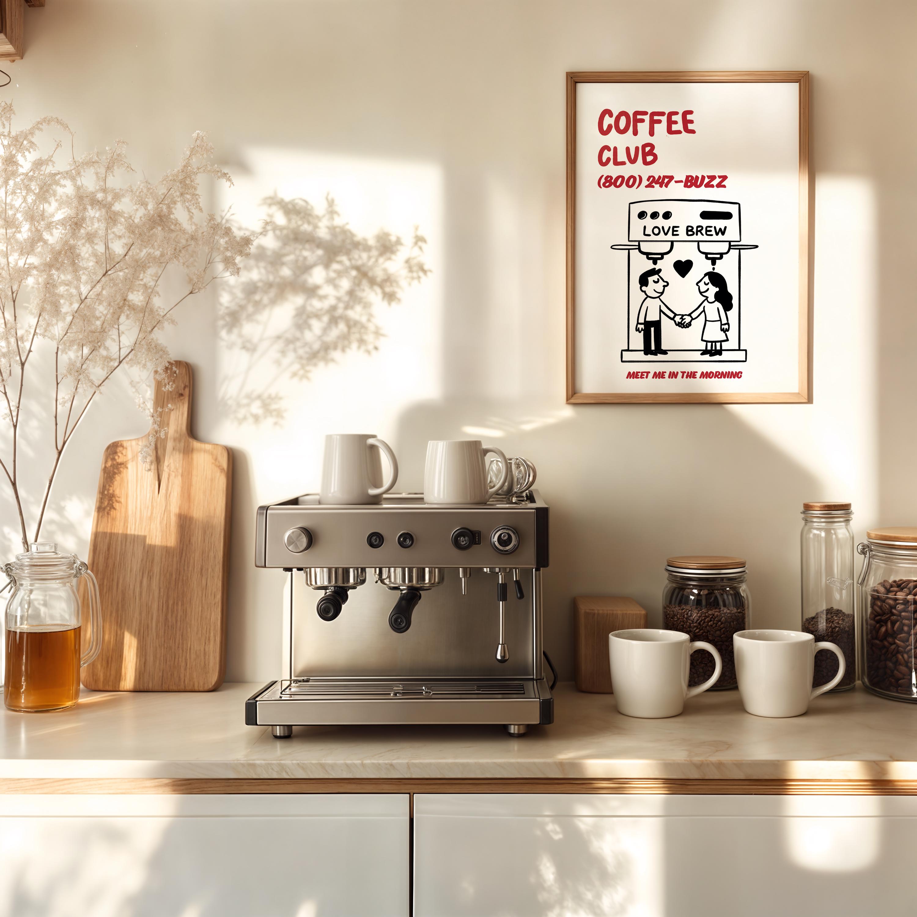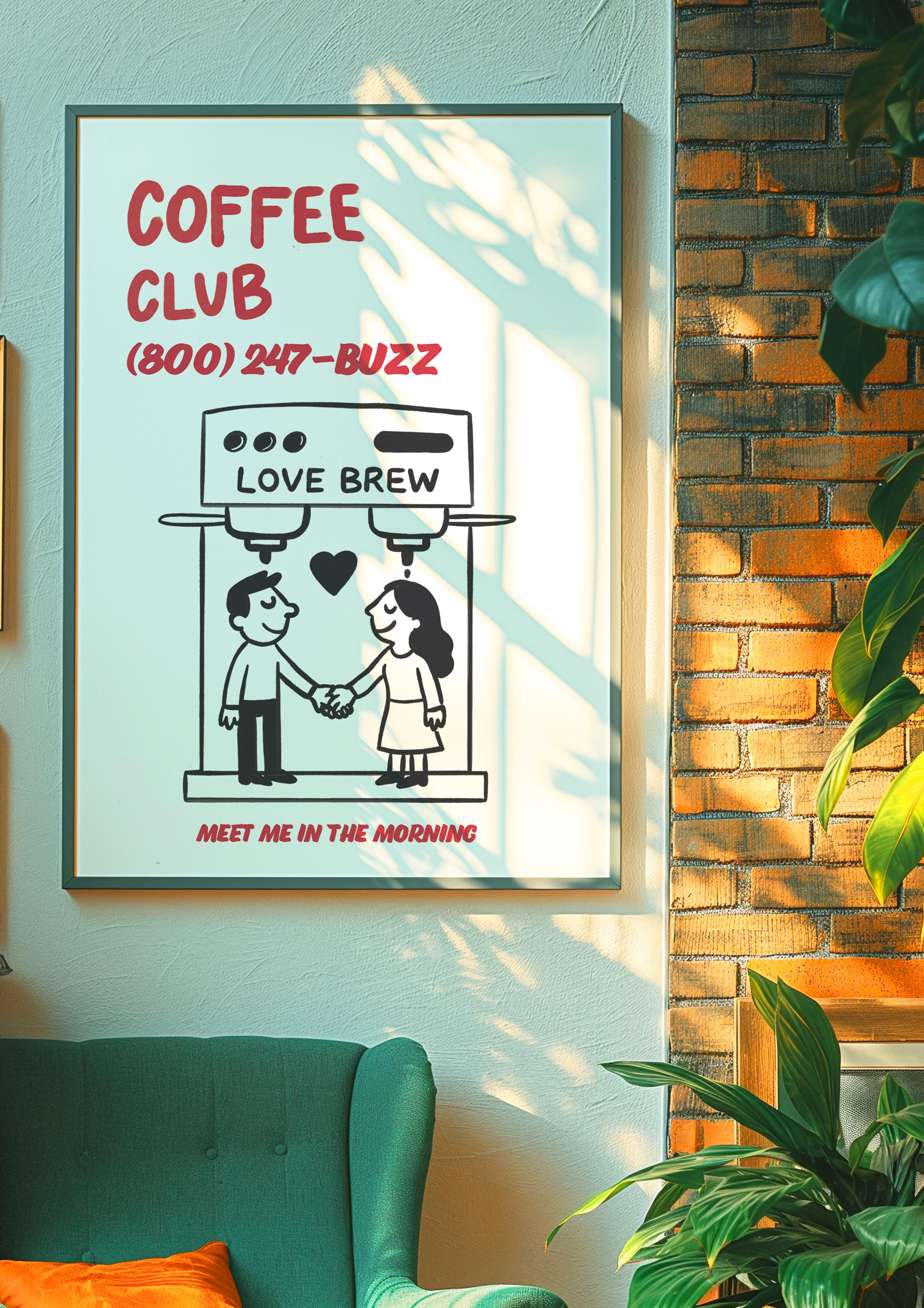 Bring charm (and caffeine) to your wall with a playful “Coffee Club” print. Designed with a retro-style couple under a “Love Brew” espresso machine and perfect for all coffee lovers, kitchens, cafés, or anyone who believes the best mornings start with a buzz.
